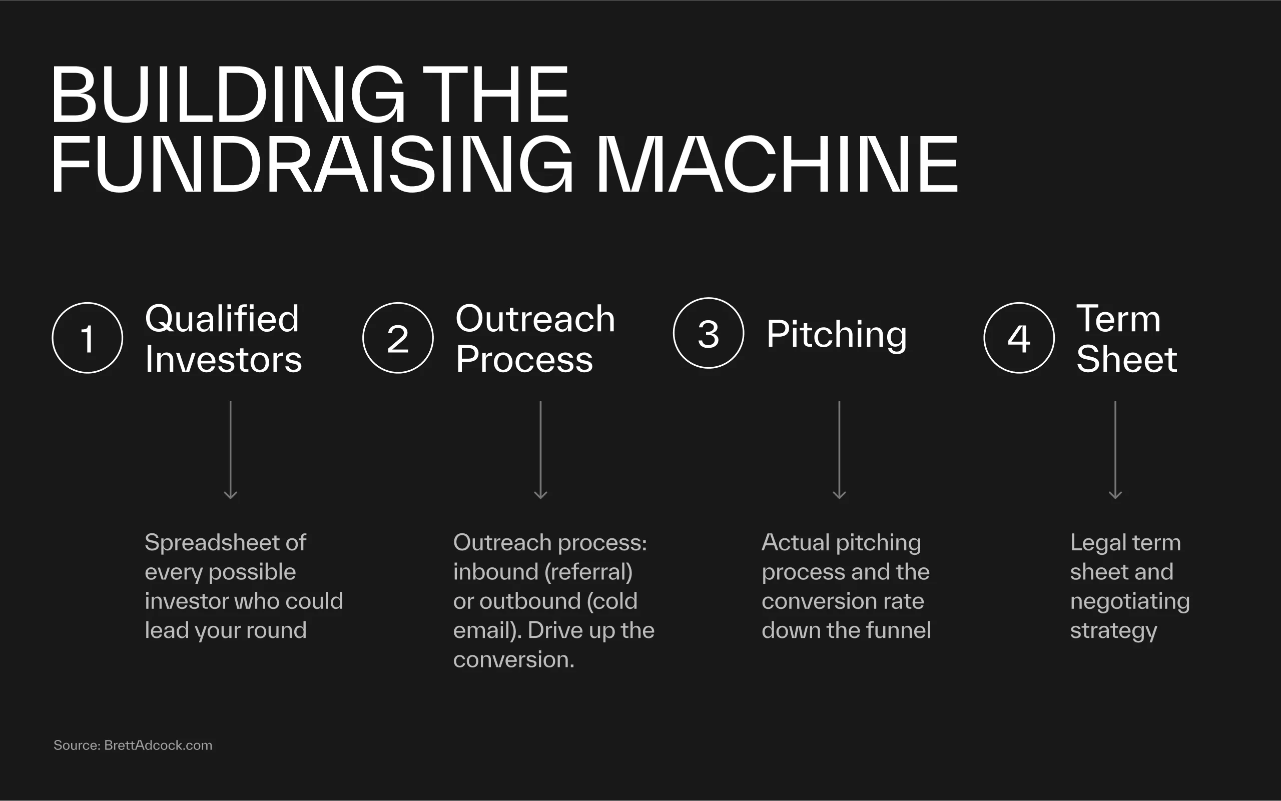 I believe in building and executing on a highly structured “machine” for fundraising processes. This machine is something you can wash, rinse, and repeat. This should be similar to how you would run a sales or marketing team.