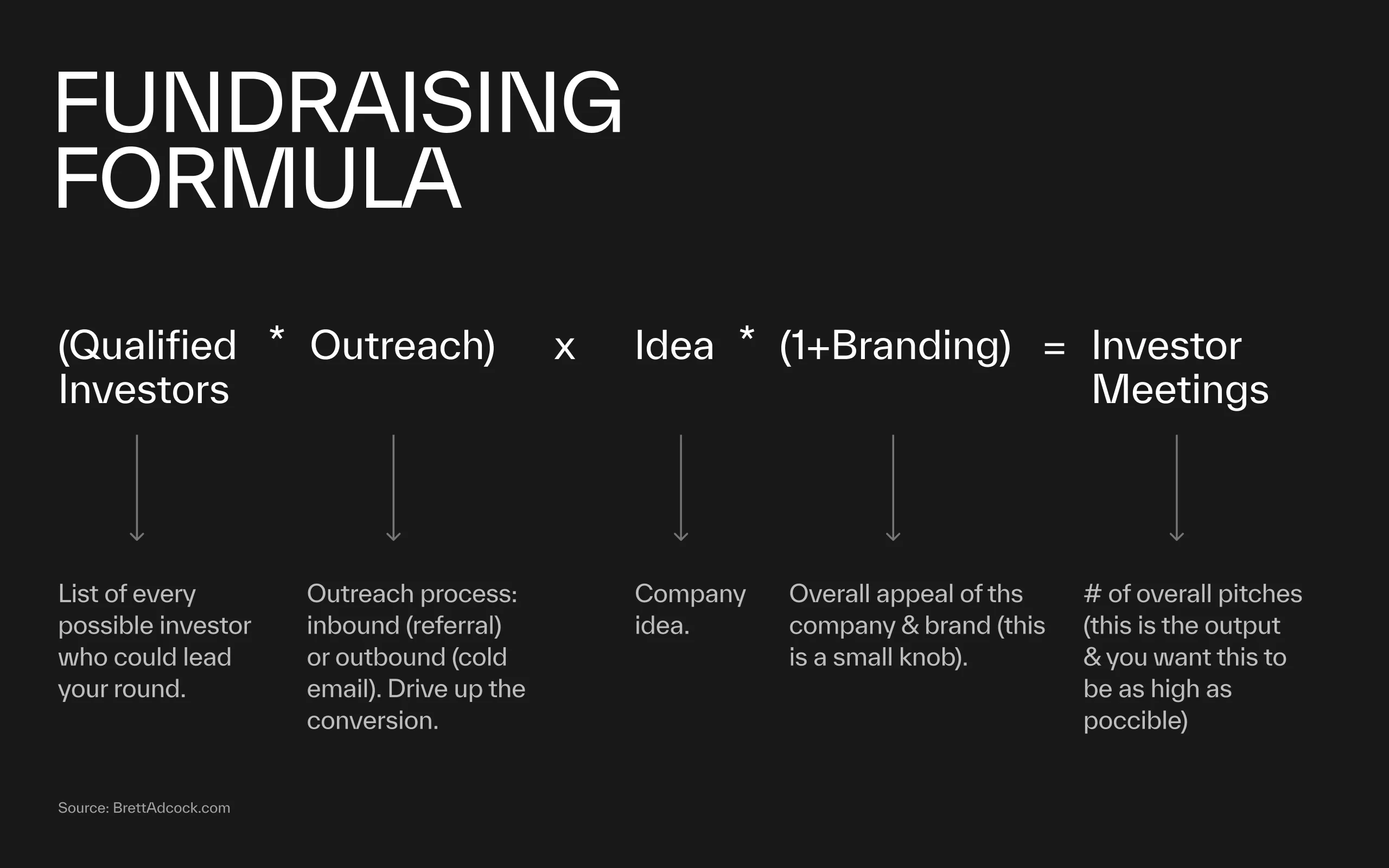 You need to maximize the amount of shots on goal in fundraising. Aim to get as many meeting attempts with investors as possible. My formula for capital raising is a combination of A) the number of qualified investors you are targeting combined with B) the company idea & overall branding.